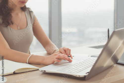 © undrey, Obraz premium Close-up portrait of an office worker browsing, searching and analyzing new business ideas, surfing the internet at her workplace.