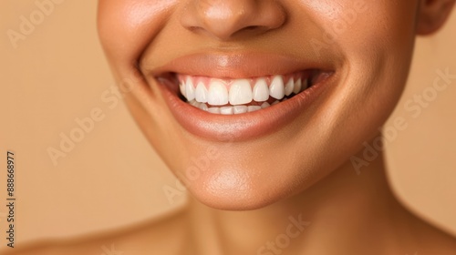 © Ghiska, Obraz premium Close up portrait of beautiful woman smiling with white teeth and healthy lips on beige background.