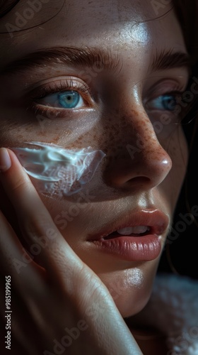 © miss irine, Fototapeta premium Close-up portrait of beautiful woman with striking blue eyes and brown hair, freckles on her cheeks. She applies cream to her face in dark background, holding small paper or card in her right hand.