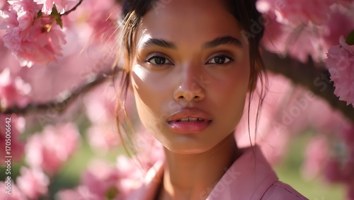 Fototapeta premium Close-Up Portrait of Beautiful Young Woman with Glowing Skin – Under Pink Cherry Blossom Trees, Dreamy Romantic Soft Light