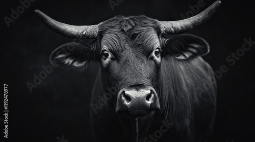 Naklejka premium close up portrait of black cow with prominent horns, showcasing its expressive eyes and detailed fur against dark background. image captures animal strength and presence