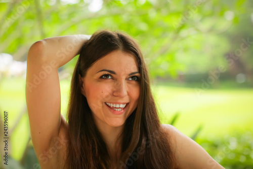 © Aleksandra, Obraz premium Close up portrait of carefree caucasian young woman posing with different emotions in green summer park.