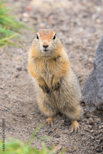 © Alexander Piragis, Naklejka premium Close up portrait of curious arctic ground squirrel, animal stands on its hind legs and carefully looking at camera. Wild animal of genus rodents of squirrel family. Kamchatka, Russian Far East, Asia.