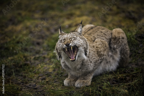 Naklejka premium Close-up portrait of Eurasian Lynx yawning in the autumn forest in the Arctic...