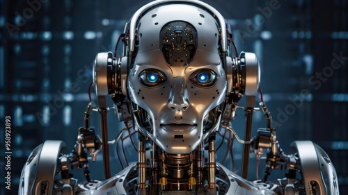 © Koltikova, Fototapeta premium close up portrait of female cyborg with artificial intelligence on gray background Artificial intelligence project.