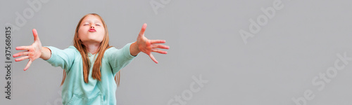 © Яна Солодкая, Fototapeta premium Close-up portrait of friendly pretty woman stretching her arms, wants to hug you, looking at camera, isolated on gray background