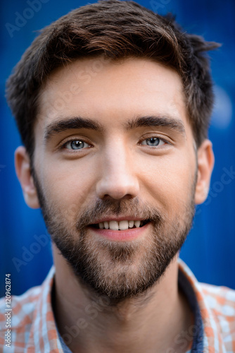 © Cookie Studio, Obraz premium Close up portrait of handsome man smiling over blue background.