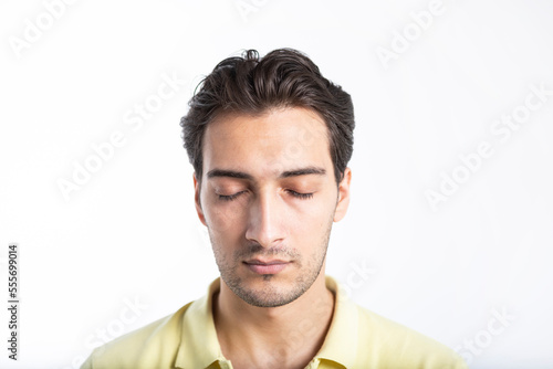 Fototapeta premium Close-up portrait of handsome man with closed eyes isolated on white background