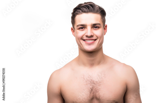 Fototapeta premium Close up portrait of handsome topless man isolated on white background