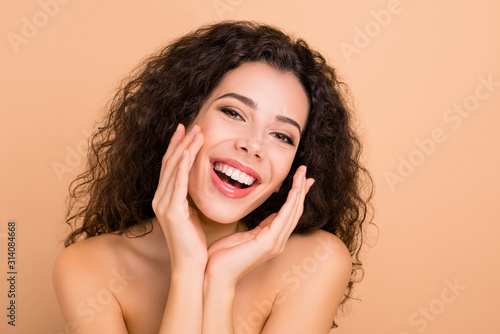 © deagreez, Fototapeta premium Close-up portrait of her she nice-looking attractive cheerful cheery positive wavy-haired girl showing perfect effective correction medicine clinic therapy treatment isolated on beige background