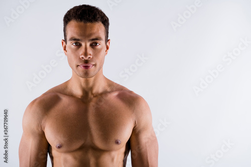 © deagreez, Fototapeta premium Close-up portrait of his he nice attractive content serious strong tanned guy working out crossfit exercise health care body care healthy life isolated over light white pastel color background