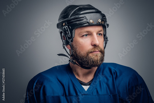 Fototapeta premium Close up portrait of ice-hockey player in safety helmet.