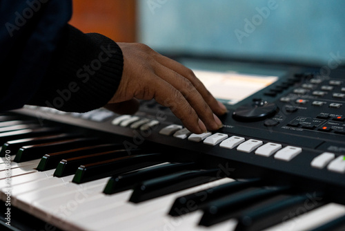© Fajar, Fototapeta premium close up portrait of male hands playing a keyboard instrument.