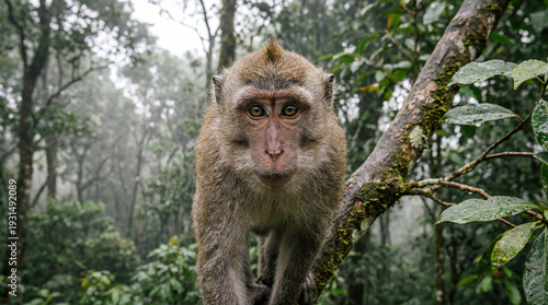 © GeniusMinus, Obraz premium Close-Up Portrait of Monkey on Mossy Tree Branch in Misty Forest