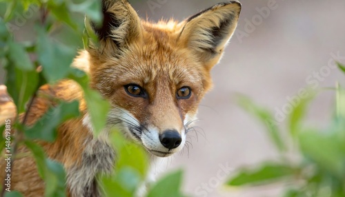 Fototapeta premium Close Up Portrait of Red Fox Looking Through Green Foliage with Attentive Eyes