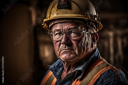 Obraz premium Close up portrait of senior construction engineer wearing safety helmet and...