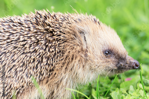 © Nikolay N. Antonov, Fototapeta premium Close up portrait of small European hedgehog on green grass. Erinaceus europaeus.
