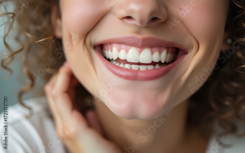 © Riley, Obraz premium Close up portrait of smiling toothy young she her woman gesturin. High quality