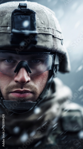 Obraz premium Close-up portrait of soldier wearing helmet and goggles in the rain.
