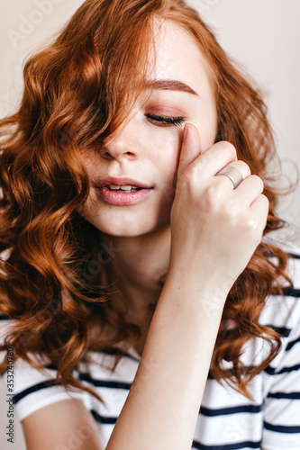 © Look!, Obraz premium Close-up portrait of spectacular european lady wears silver ring. Joyful ginger girl posing with eyes closed.