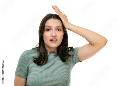 © Andrew Mayovskyy, Fototapeta premium Close up portrait of surprised girl grimace on her face, with mouth opened in shout isolated on white. Beautiful young caucasian woman touching her head with shock impression posing in studio.