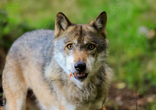 © Hana Duncova, Fototapeta premium Close-up portrait of the wolf in a natural environment of a green forest. European grey wolf, Canis lupus.
