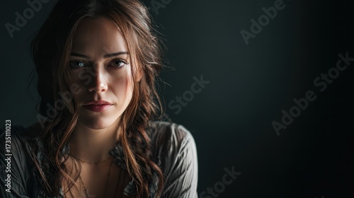 © Kitsada, Fototapeta premium Close up portrait of thoughtful young woman with long wavy hair and natural makeup in dark studio setting