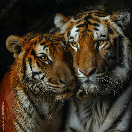 © Siasart Studio, Fototapeta premium Close-Up Portrait of Two Tigers Cuddling, Realistic Image