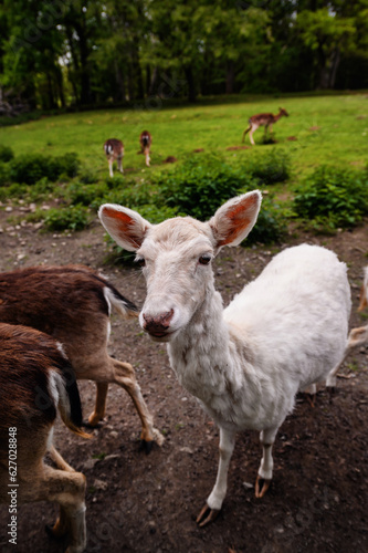 Fototapeta premium CLose-up portrait of white albino deer in reserve aviary