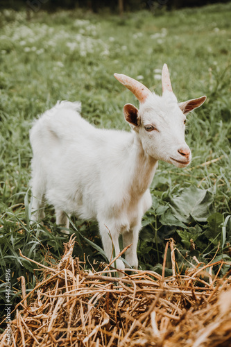 © Katerina, Obraz premium close up portrait of white goat on green grass and haystack