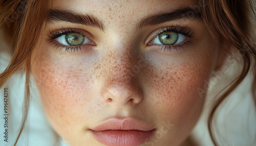 © MaradelAlcor, Fototapeta premium Close-up Portrait of Woman with Freckles and Green Eyes