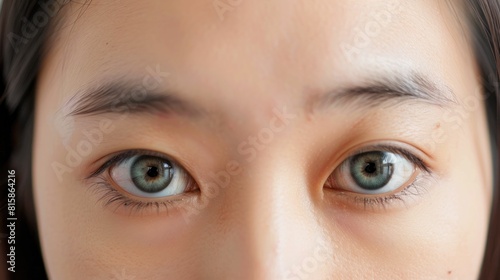 Fototapeta premium Close up portrait of young Asian woman with striking green eyes and long...