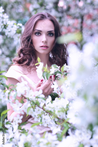 Fototapeta premium Close-up portrait of young beautiful woman in spring blossom tre