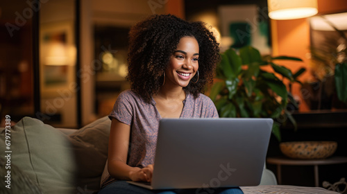 Fototapeta premium Close up portrait of young beautiful woman smiling while working with laptop...