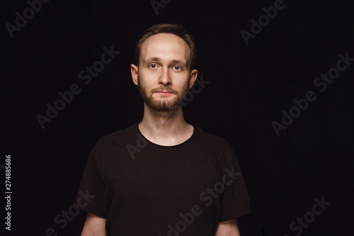 Fototapeta premium Close up portrait of young caucasian man isolated on black studio background....