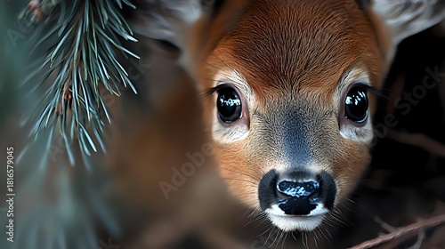 © Yuliia, Obraz premium Close-up portrait of young deer fawn with large eyes and wet nose, showing innocent expression against blurred forest background.