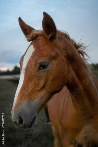 Naklejka premium Close up portrait of young foal with white blaze on forehead standing on...