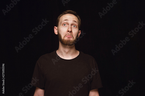 Naklejka premium Close up portrait of young man isolated on black studio background. Photoshot...
