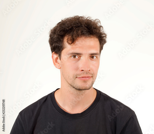 © lukas_zb, Fototapeta premium Close-up portrait of young pleased man in black T-shirt