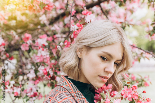 © Andreshkova Nastya, Fototapeta premium Close up portrait of young pretty caucasian curly blondie model posing outdoors in pink blossom garden. Beauty, nature concept