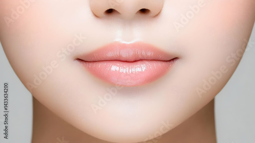 © deon, Fototapeta premium Close Up Portrait Of Young Woman's Lips And Chin With Pink Glossy Lipstick And Smooth Skin
