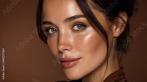 Obraz premium Close up portrait of young woman with glowing skin, soft makeup, and natural beauty. Her expressive eyes and subtle smile convey confidence and warmth, set against warm, neutral background