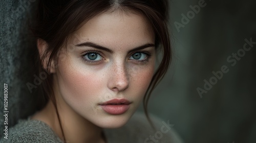 Obraz premium Close up Portrait of Young Woman with Green Eyes and Freckles