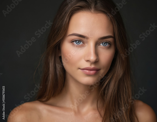 © Viktor, Fototapeta premium Close-up portrait of young woman with striking blue eyes, gentle smile. Long, smooth brown hair frames face with clean, fresh skin, natural makeup. Monochrome background enhances attractive features,