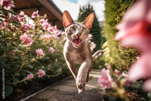 Obraz premium Close-up portrait photography of a happy oriental shorthair cat jumping against a charming garden path. With generative AI technology