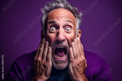 © Markus Schröder, Fototapeta premium Close-up portrait photography of a satisfied mature man making a surprise gesture by covering one's mouth against a vibrant purple background. With generative AI technology