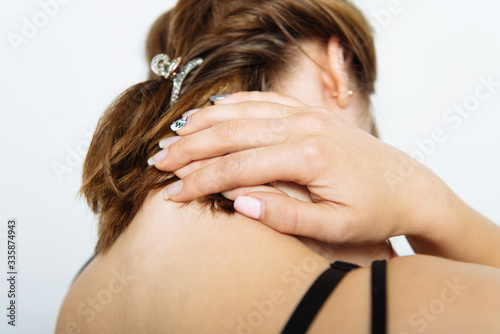 Fototapeta premium Close Up portrait stressed unhappy, young pretty woman with bad chronic neck...