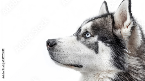 © AstraNova, Obraz premium Close-up portrait view of adorable Siberian Husky dog head and face looking from side view isolated on white background