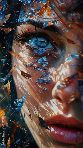 Fototapeta premium Close-up Portrait with Abstract Leaves and Shattered Glass