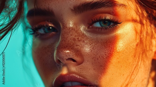 Fototapeta premium Close-up portrait with golden sunlight highlighting freckles